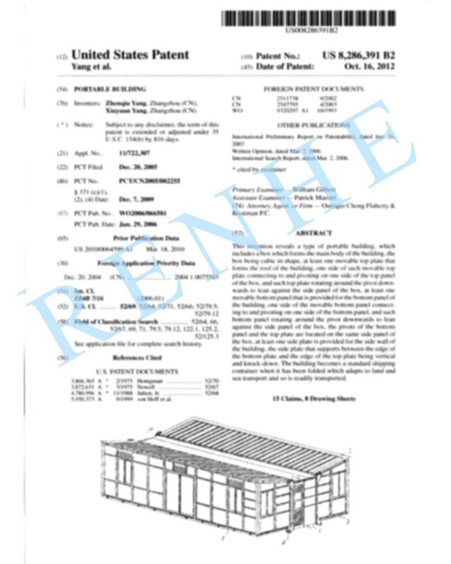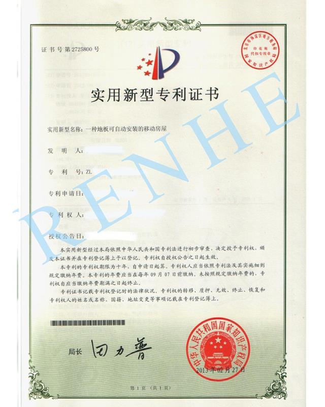 一種地板可自動安裝的移動房屋實用新型專利證書