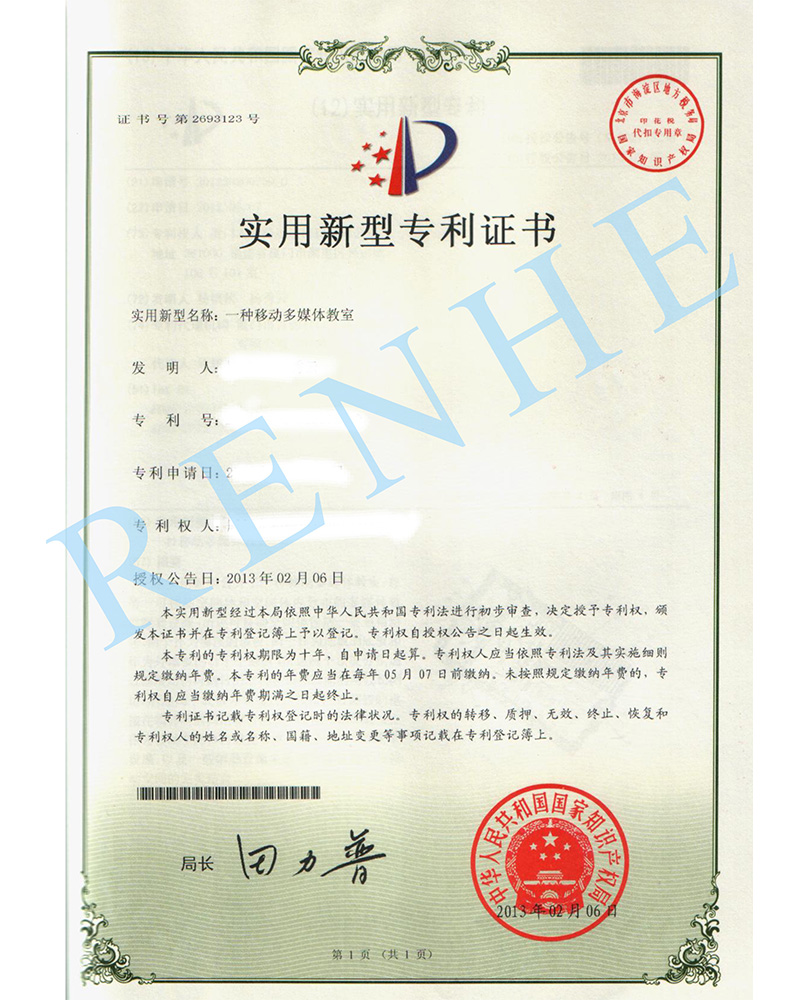 一種移動多媒體教室實用新型專利證書