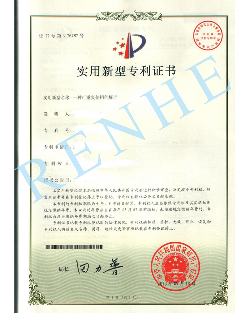 一種可重復使用的展廳實用新型專利證書
