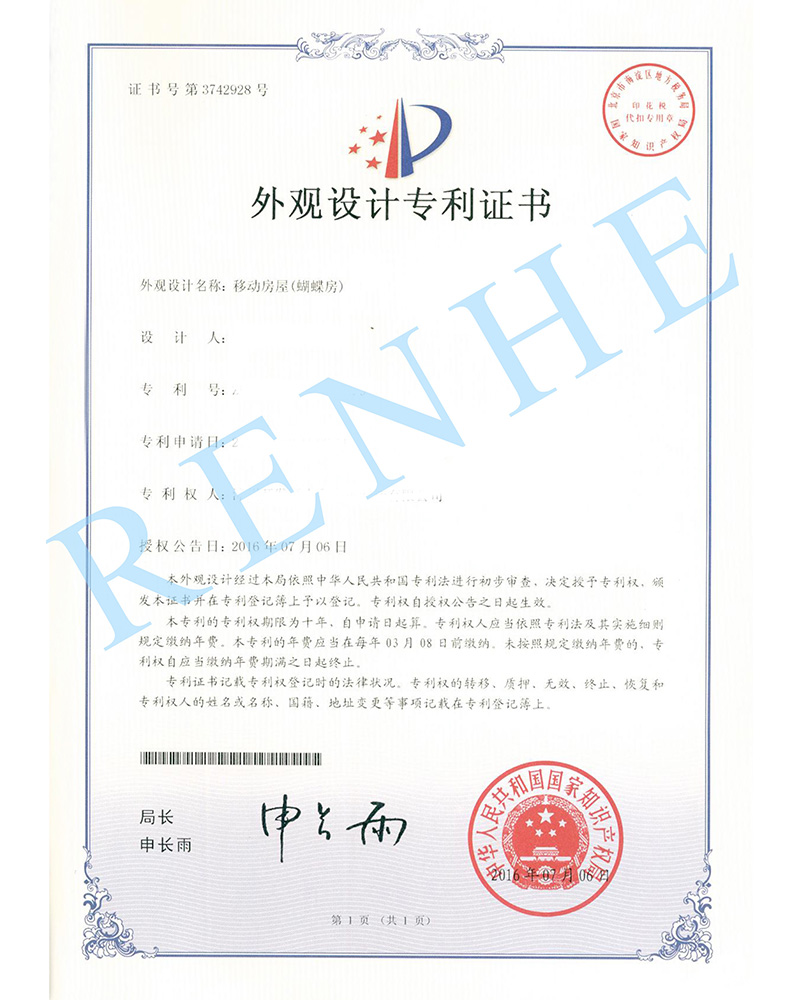移動房屋(蝴蝶房)外觀設計專利證書