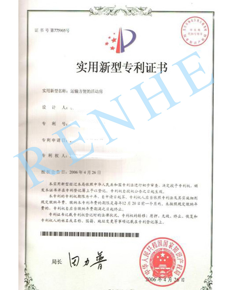 運輸方便的活動房實用新型專利證書